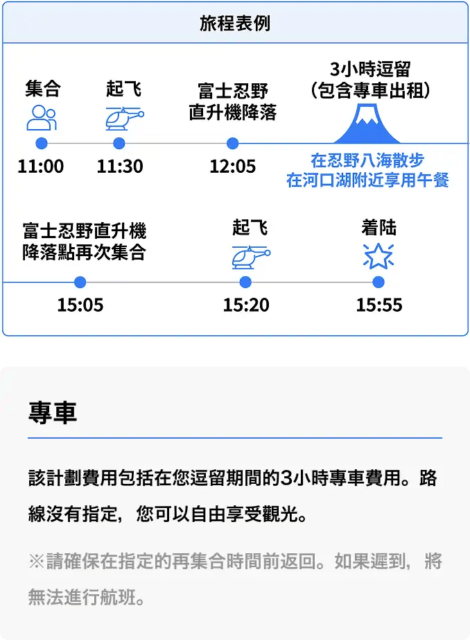前往富士忍野直升機場單程約 35 分鐘。入住期間,您可以乘坐出租車遊覽忍野八海和山中湖等熱門觀光景點。是直升機往返+出租車的豪華一日遊計劃。